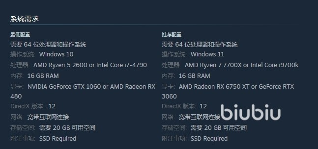 当前官方公布了两种PC配置标准,分为最低配置与推荐配置两档。最低配置:系统Windows 10、选择AMD R5 2600或intel i7-4790两种处理器都可以、16GB内存、显卡选英伟达GTX 1060或AMD的RX 480,这套配置足够支持游戏维持1080p低画质运行。而推荐的配置则是:系统Windows 11、处理器可选AMD R7 7700X或者intel i9-700K、16GB内存、3060显卡或者RX 6750 XT,这套配置可流畅运行游戏特效与高分辨率。