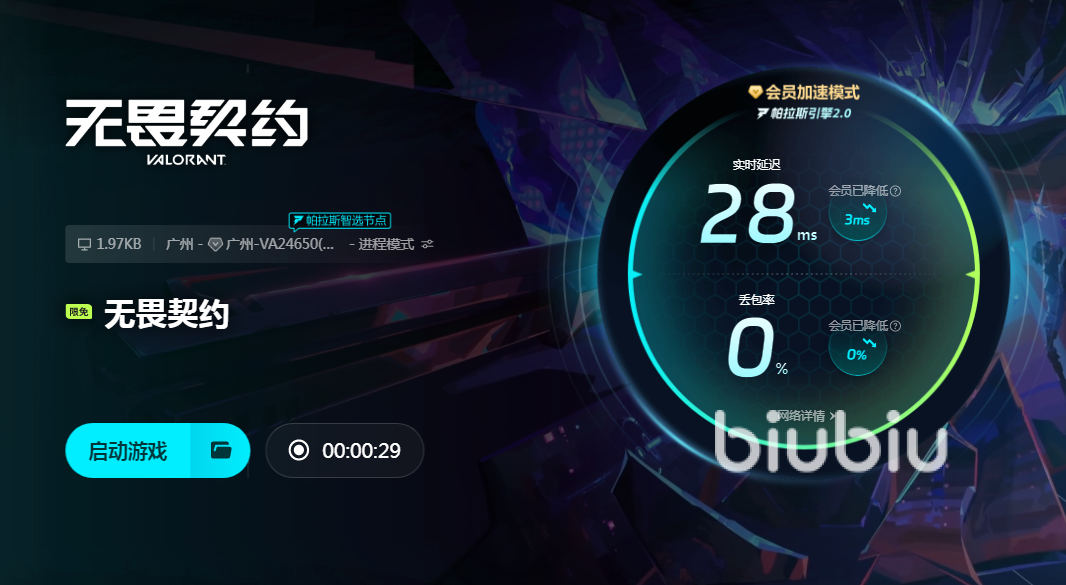 其实,作为PC游戏,无畏契约非常容易受到一些常见的原因造成网络问题,这也是为什么 需要给游戏配置一个加速器的原因,比如,玩家家庭中使用网络的设备较多,在同时使用的时候,玩游戏的网速就会被挤占,出现卡顿,延迟,同时,玩游戏的时候,如果需要开其他软件,比如看电影、视频聊天,就可能占用游戏网速,出现延迟、卡顿或者直接闪退的问题,还有,一般人打游戏的时间是在周末和晚上,此时游戏服务器很容易因为登录玩家过多,而出现拥挤,即使进入游戏的玩家也会出现卡顿、延迟、掉帧的情况。这些都是游戏加速器能够解决的问题。这里推荐使用小编这些年一直用的biubiu加速器。