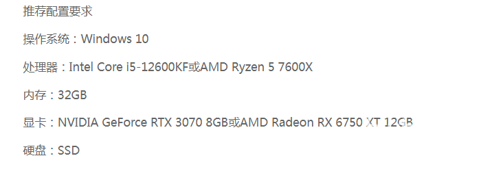 推荐配置中,需要玩家的cpu达到I5-12600kf这个级别,然后内存条容量要达到32GB,显卡肯定是最重要的,一定要有3070 8GB以上,运行中等画质才行,如果想要更好的效果,配置肯定是越高越好。