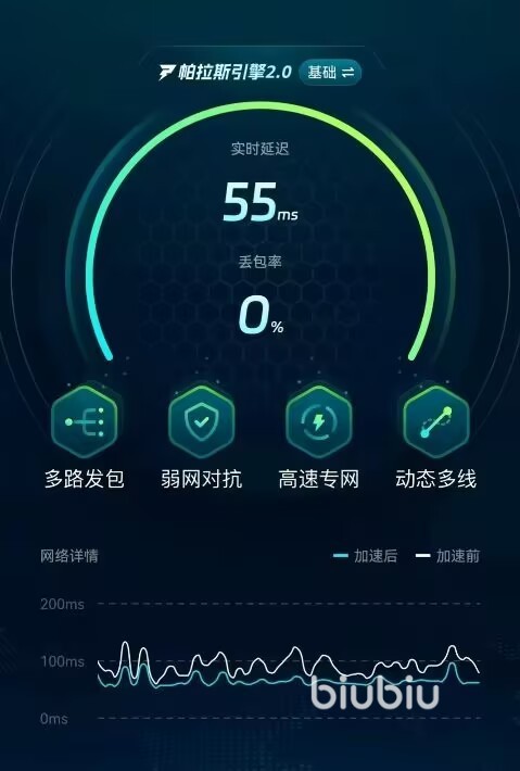 专业的优化路线智能的筛选,并且大家是可以在后台查看相关数据的,ping值基本是出于绿色状态,而丢包率会降低为零,让伙伴们更加透彻的了解自己当前的网络状况。一次只能够给一款游戏提供优化服务,所以在退出游戏的同时记得停止加速。