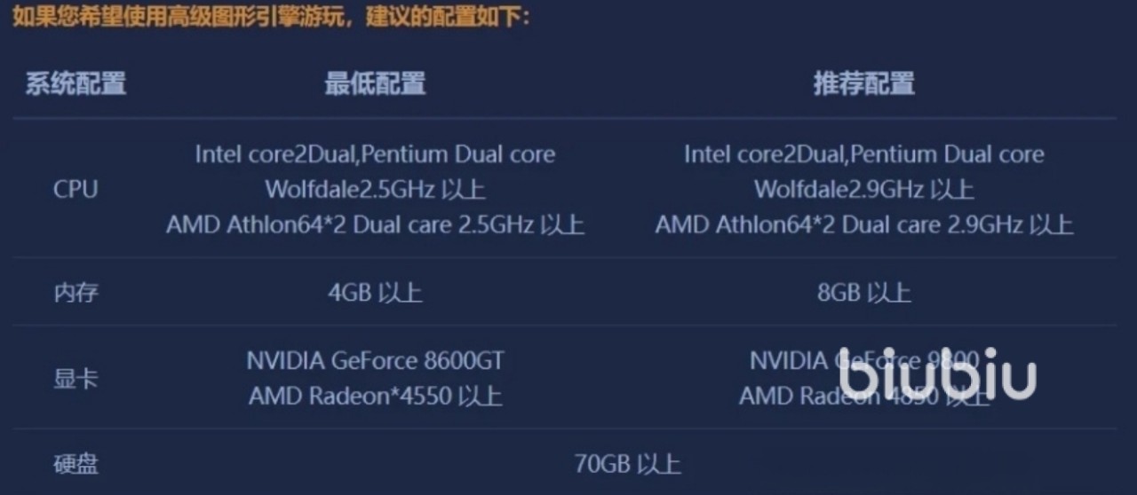 预期最低配置Windows 10/11保障基础运行环境,处理器Intel core2Dual或者Pentium Dual core或同级别性能以上,内存4GB RAM,显卡英伟达 GeForce 8600GT AMD Radeon4550以上,保证1080P中等画质下相对稳定流畅表现,存储50GB,NVMe固态硬盘将极大减少地图加载延迟,缓解战斗中的卡顿问题。