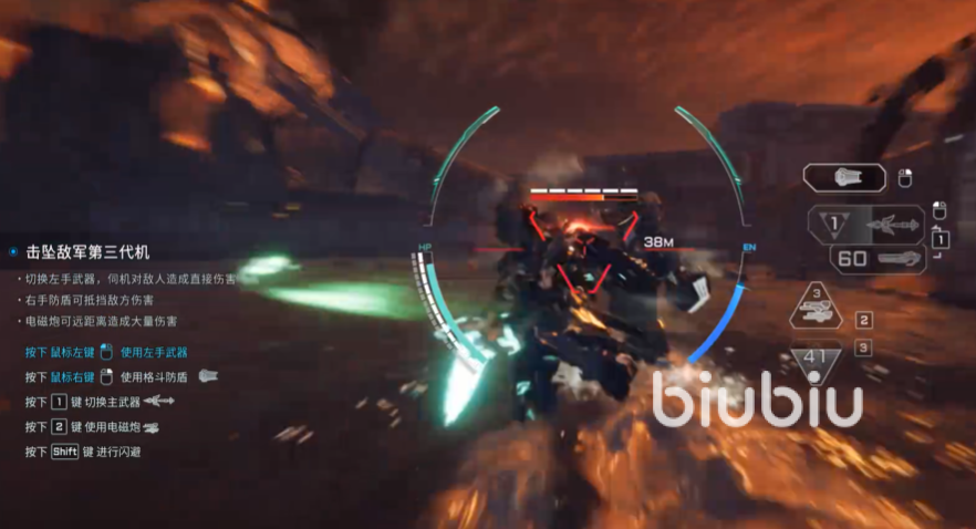 然后就是打巨型机兵马卡鲁,按照左侧提示进攻,鼠标左边为武器,右键是格斗放盾,1是切换主武器用技能攻击,2则是电磁炮,另外这里还会有系统安排的帮手作战,实际挑战并不难。