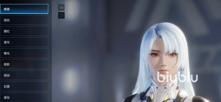 其他面部可以细微调整下,眼睛稍微拉大,眼尾上翘,鼻翼稍微调整拉小一点,不要捏的太小太细,就失去真实感了,嘴巴不用调整,下巴稍微捏尖一点。眉毛可以调为棕灰色,然后发色改为冰蓝渐变,一个御姐外观就出来了。