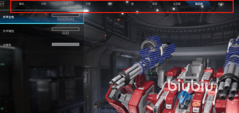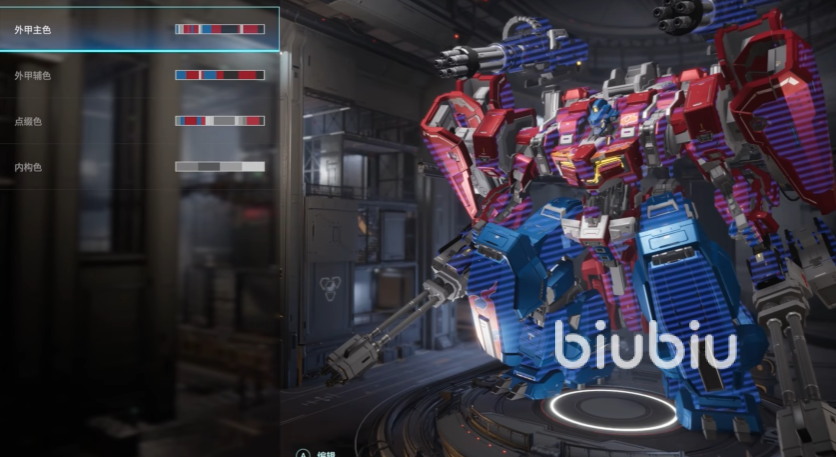 为了高度实现定制化配色,有调节部位供玩家细致更改。一个机甲是分成内构,头部,手臂还有躯干等等部位的,选取之后对4个选项分别设置,直到调整到自己满意为止。