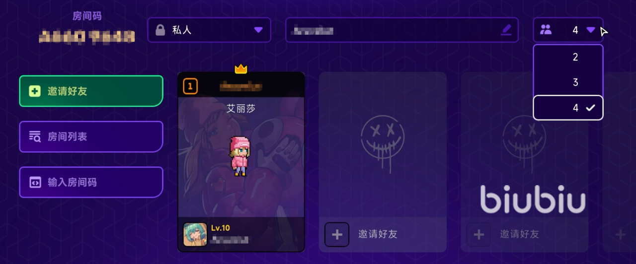 进入界面后可直接邀请好友,好友确认同意后即可一起开黑了。也可以通过邀请好友加入自己建立的房间来进行游戏,下图就是房间的面板了,通过房间码搜索房间号可以加入别人建立的房间游玩。而且房主可以规定联机人数。