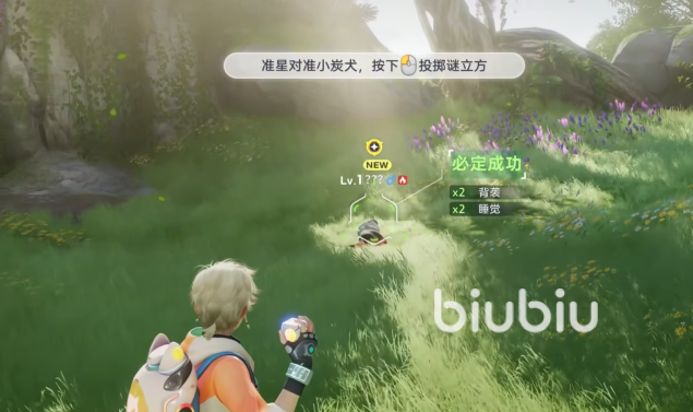 引导系统做的细致,首先从简单的宠物入手,指引抓捕小炭犬。一上来明确告诉玩家背后偷袭更容易捕获宠物,也留了足够的时间让玩家瞄准准心,快速利用谜立方成功收服。