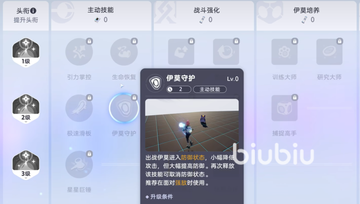 角色也有自己独特的成长系统,主动技能有引力掌控,生命恢复以及伊莫守护等,分别有提升掌控力,增强血量以及加强出战伊莫防御效果的作用。