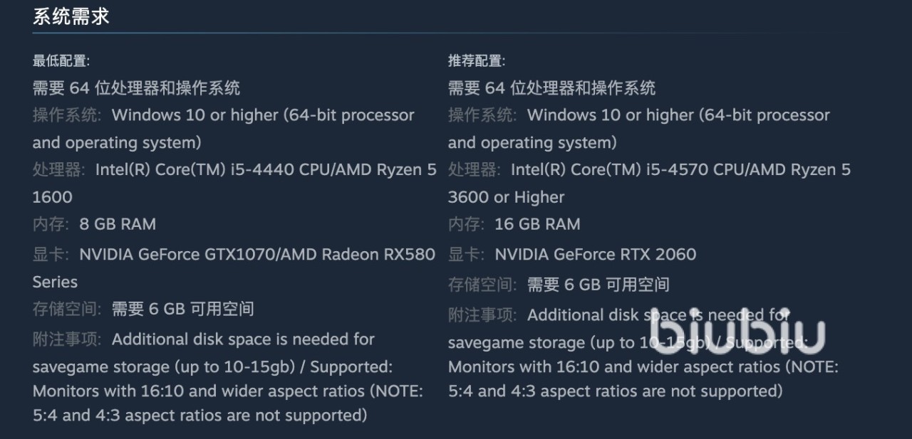 该作的配置不算高,要求如下:最低配置需64位Win10系统,处理器是酷睿i5四代4440及以上型号,内存8GB,显卡用英伟达 GTX 1070/AMD RX 580系列,硬盘为6GB可用空间且预留10 - 15GB存档空间;更多详细信息请看下图:
