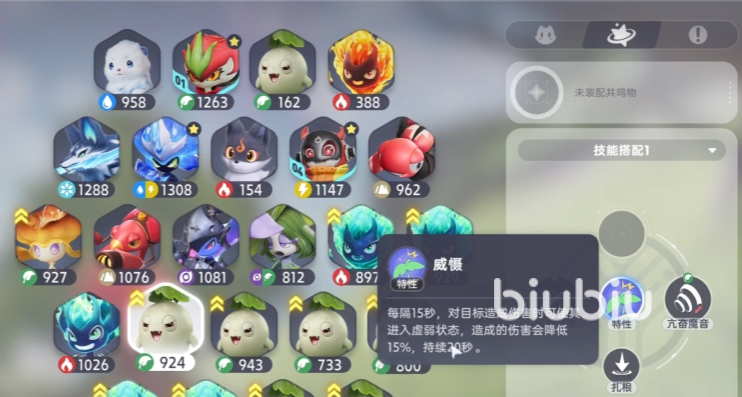 围绕它为核心,搭配一个走调草,就算是普通特性都够用,它的威慑能力是每隔15秒就会对目标造成伤害并使其进入虚弱状态,并且怪物造成的伤害会降低15%,持续20秒,如果是稀有特性能力更强。降低敌方防御以及输出,搭配上暴击快速清理怪物没问题。这个效果还能被全队共享,实用性更高。