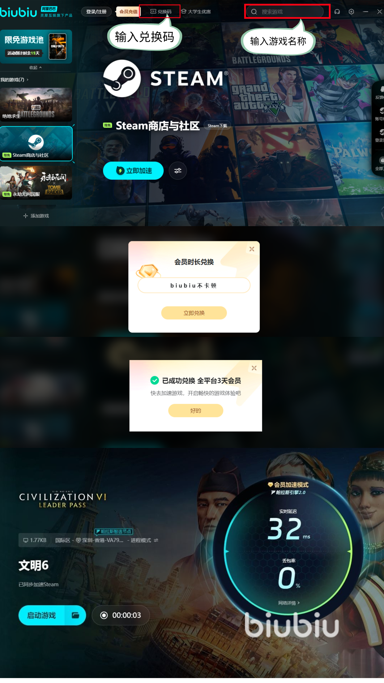 因为大家玩很多电脑游戏都需要用到加速器,所以小编也给大家带来了一款超级适合文明6这款作品的加速应用——biubiu,新用户登录现在立刻就可以享受一整天的免费加速时长,此外,平台的每个小伙伴还可以通过【biubiu不卡顿】额外领取三天的体验时间,都是无偿免费提供的。