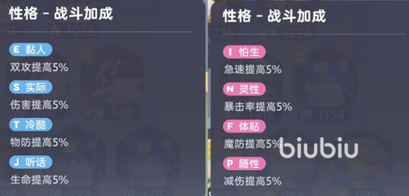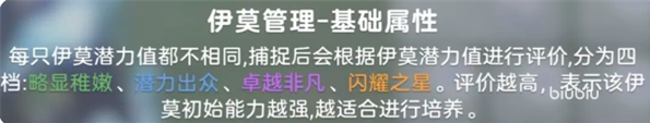 而伊莫的培养其实有很多学问,种族值会显示当前宠物不同属性的优劣点,作为后续培养方向的参考。另外伊莫还会有各自的性格,比如黏人是双攻提高5%,怕生是急速提高5%,按照需求选取性格以及搭配。