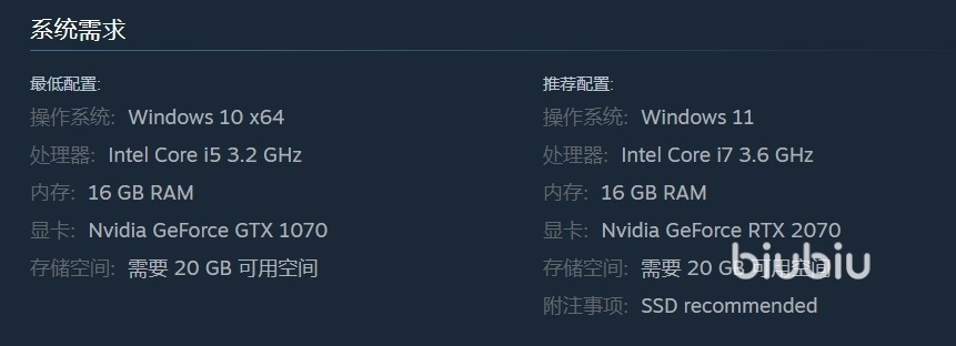 游戏需要运行在Windows 10 x64操作系统上,处理器英特尔 Core i5 3.2 GHz,内存16 GB RAM。显卡英伟达 GeForce GTX 1070,这能够保证游戏在中等画质下流畅运行。此外,玩家需要确保设备上有20 GB的可用存储空间,以便安装游戏。