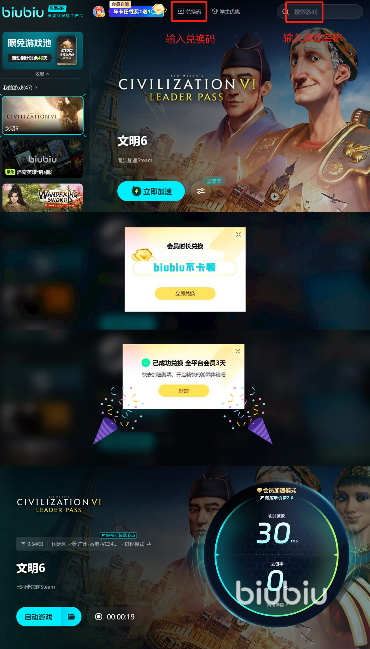 文明6支持联机互动,对网络有着一定的要求,玩家们可以下载上方链接的biubiu加速器,为游戏联网保驾护航。现在新人注册可免费领取24小时的免费加速时间,输入兑换码【biubiu不卡顿】还可以领取72小时,总共累计96小时的免费加速时长。