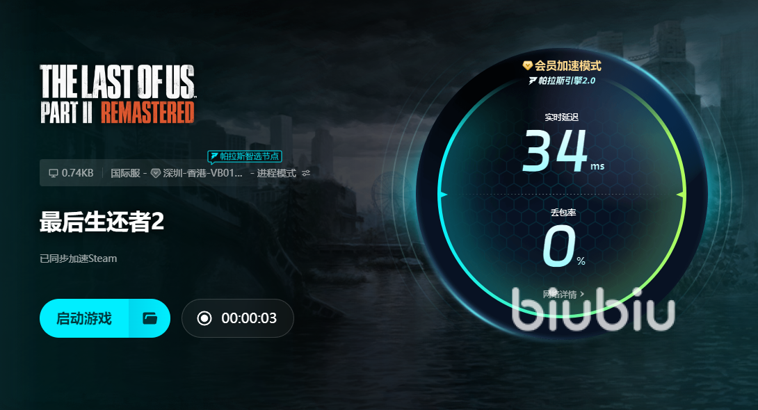 在提升稳定性的同时,biubiu加速器也极大简化了加速操作流程,对于不熟悉网络设置的玩家而言尤其友好。传统加速器可能需要繁琐的手动配置,而biubiu的操作过程非常直观。玩家只需打开biubiu,选择《最后生还者2重制版》进行一键加速,系统会自动完成所有网络优化操作,无需任何技术背景。加之其内置的网络状况监控功能,玩家可以清楚了解当前的加速效果与延迟状况,做到心中有数,防止因网络波动而引发的问题。这种贴心的设计,让biubiu不仅成为解决闪退的工具,也成为日常游戏中的稳定保障,让每一场游戏都安心无忧。