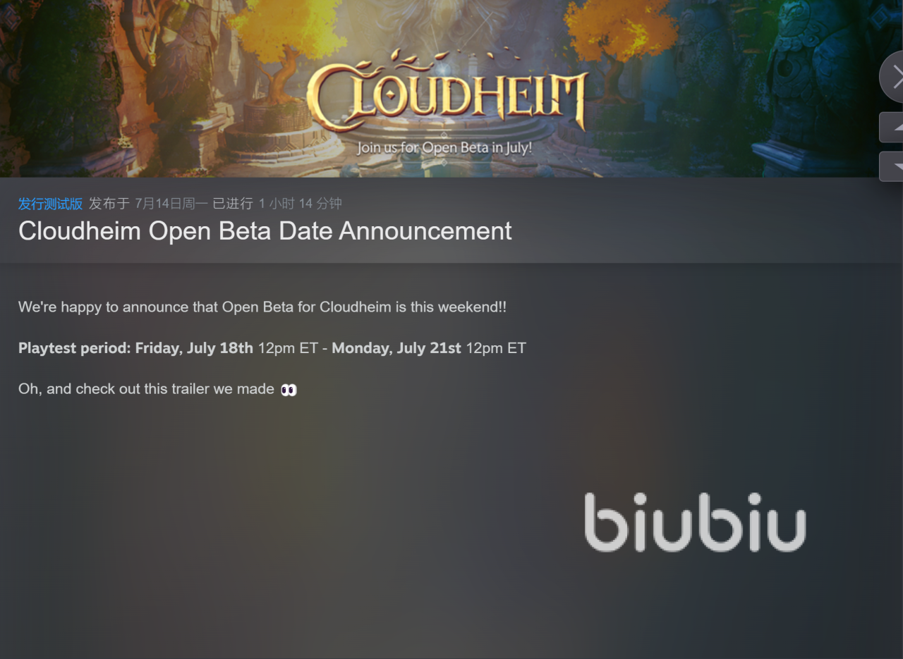 2025年07月15日 16:22 来源:灼热冰化石翼龙云之国Cloudheim测试资格如何获取是近期玩家关注的重点。尽管目前官网并没有内测资格申请入口,steam平台的Request Access也尚未正式开放,但开发商Noodle Cat Games在2025年7月14日发表的公告中称,内测开启的时间为7月18日-21日。此外,6月的预告中明确表示“感兴趣的玩家可提前提交测试申请”,下面就和小编一起看看具体的信息以及建议吧。