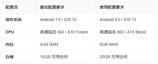 手游因为使用的是手机这种移动设备,所以对优化的要求较高一些,厂商也会尽力做好优化,让大部分玩家能顺畅运行。建议玩家的操作系统达到Android 9.0 / iOS 13以上,cpu有高通骁龙 865 / A13 Bionic这个水平,内存保证在6GB左右,运行游戏就很流畅了。存储空间需要留够,最少需要15GB空间,后续官方更新也会增加程序容量,预留20GB空间更好。手机毕竟是实用型设备,其他功能性APP也不少,必要时删减不常用的程序,以及关闭后台应用,让机器运算更快速。