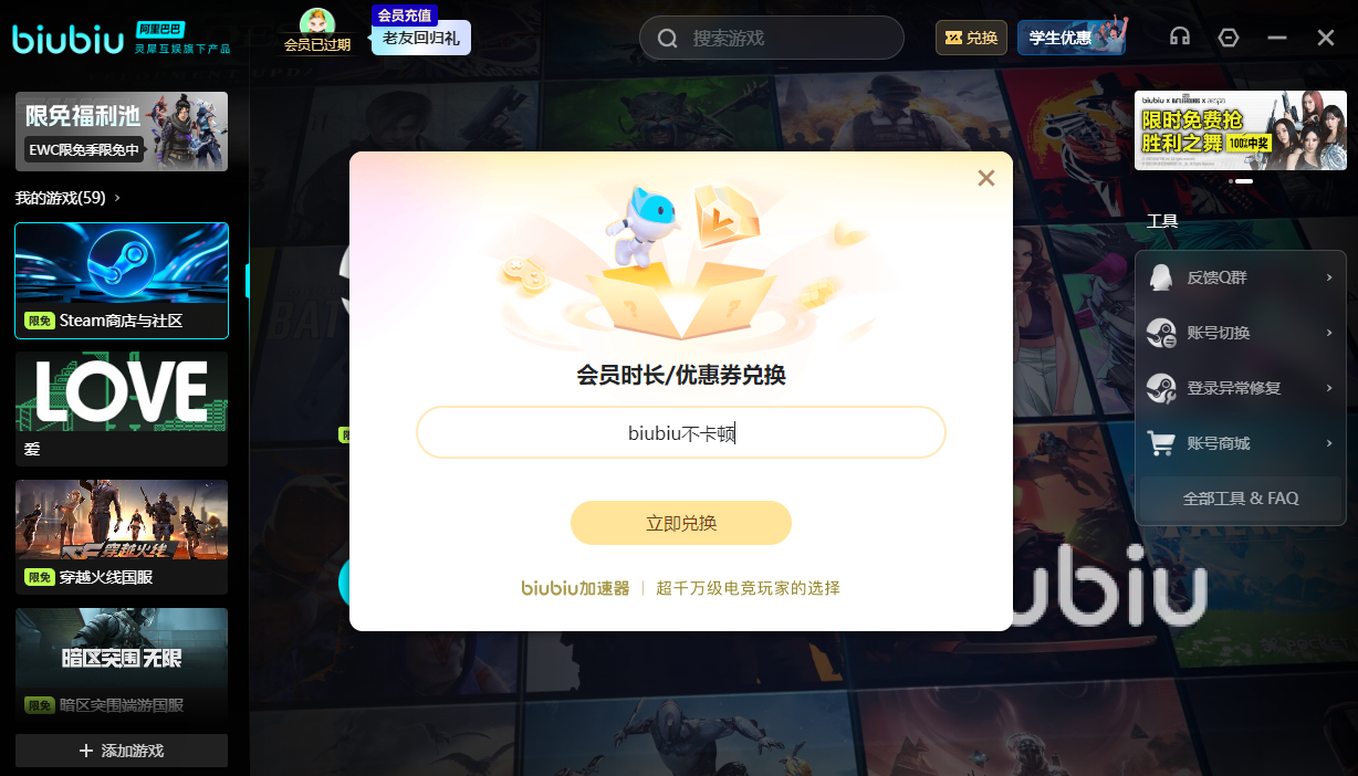 说再多都不如大家自己去试一试,尤其是新用户,小编给大家带来的这款加速应用提供了不少福利,新人登录立刻就可以得到平台赠送的24小时免费提速服务,若是觉得时间不够,后续还可以再用【biubiu不卡顿】再次兑换得到三天的加速时长,也是不需要花钱的,且每个小伙伴都可以兑换一次,目前暂没有停止时间。
