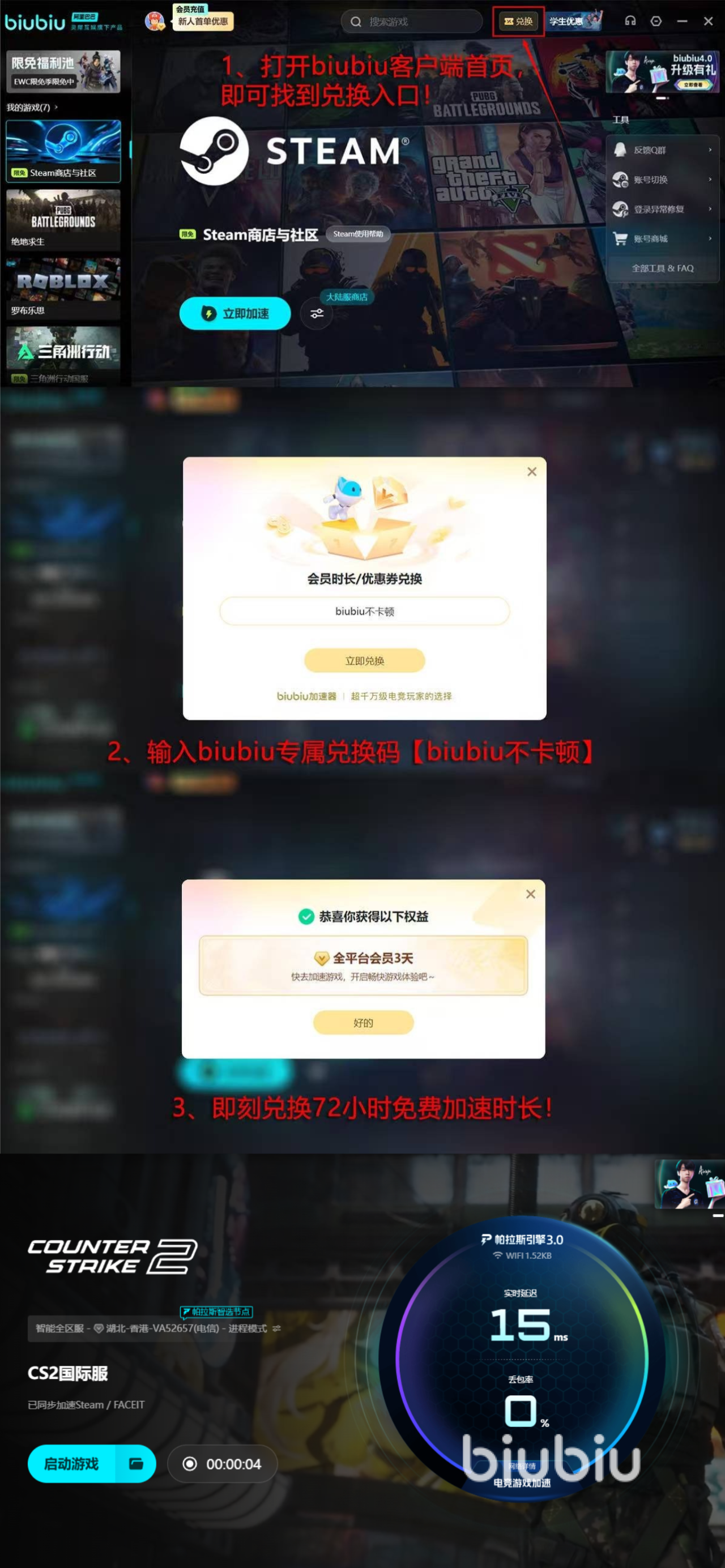 由于这款游戏是竞技类型的,所以大家玩的时候可以用加速器,这样无论是攻方还是首方都可以保证网络的通畅,最大化的发挥个人技术。现在新人下载上方分享的biubiu可以得到24小时免费提速时间,官方直接赠送,此外还提供了三天额外的提速福利,但是需要大家自己通过在对应区域输入【biubiu不卡顿】进行兑换才行。