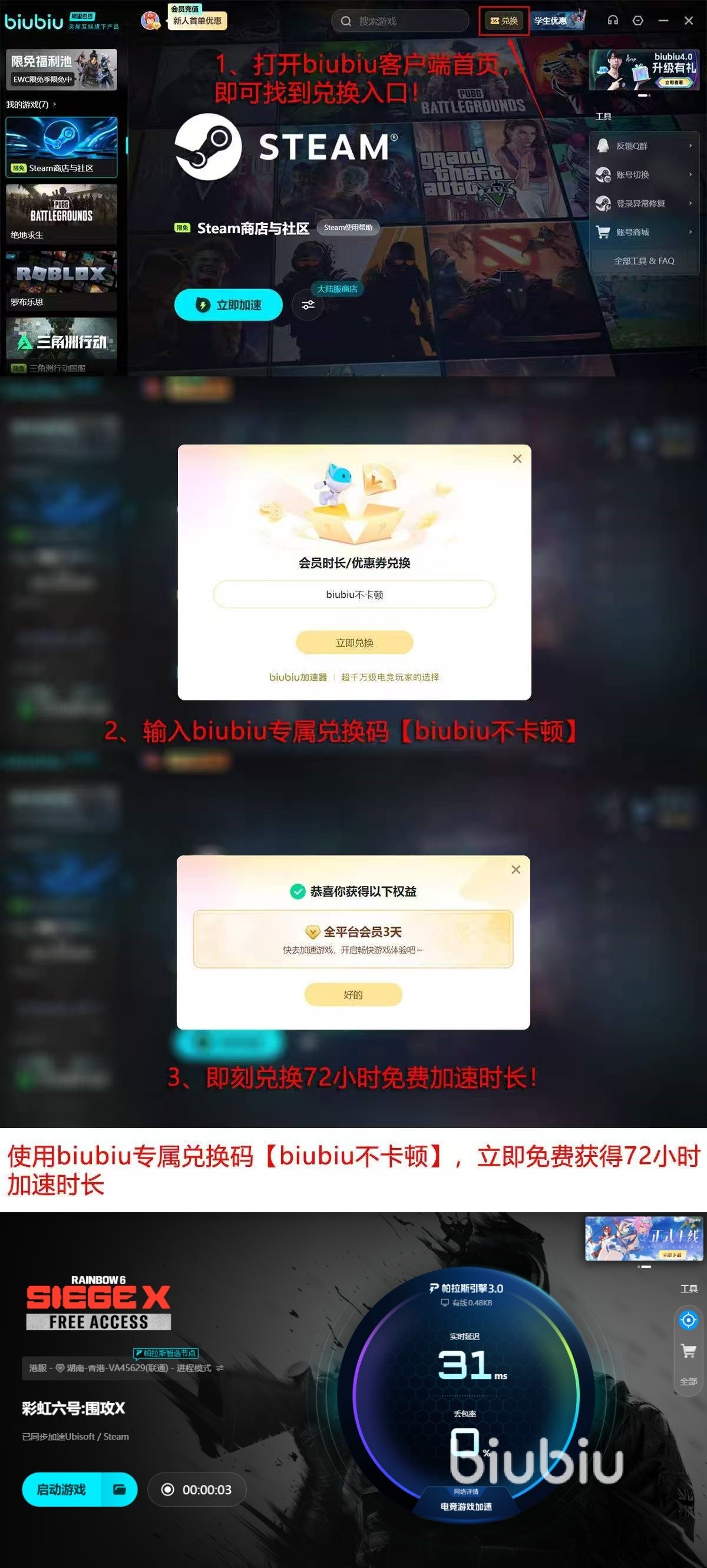 而对于广大小伙伴们而言,若是希望能去解锁更多加加速机会,还可主动去点击兑换,在输入【biubiu不卡顿】,如此一来所有平台用户均可顺利领取到72H的加速,还是非常给力的哦。