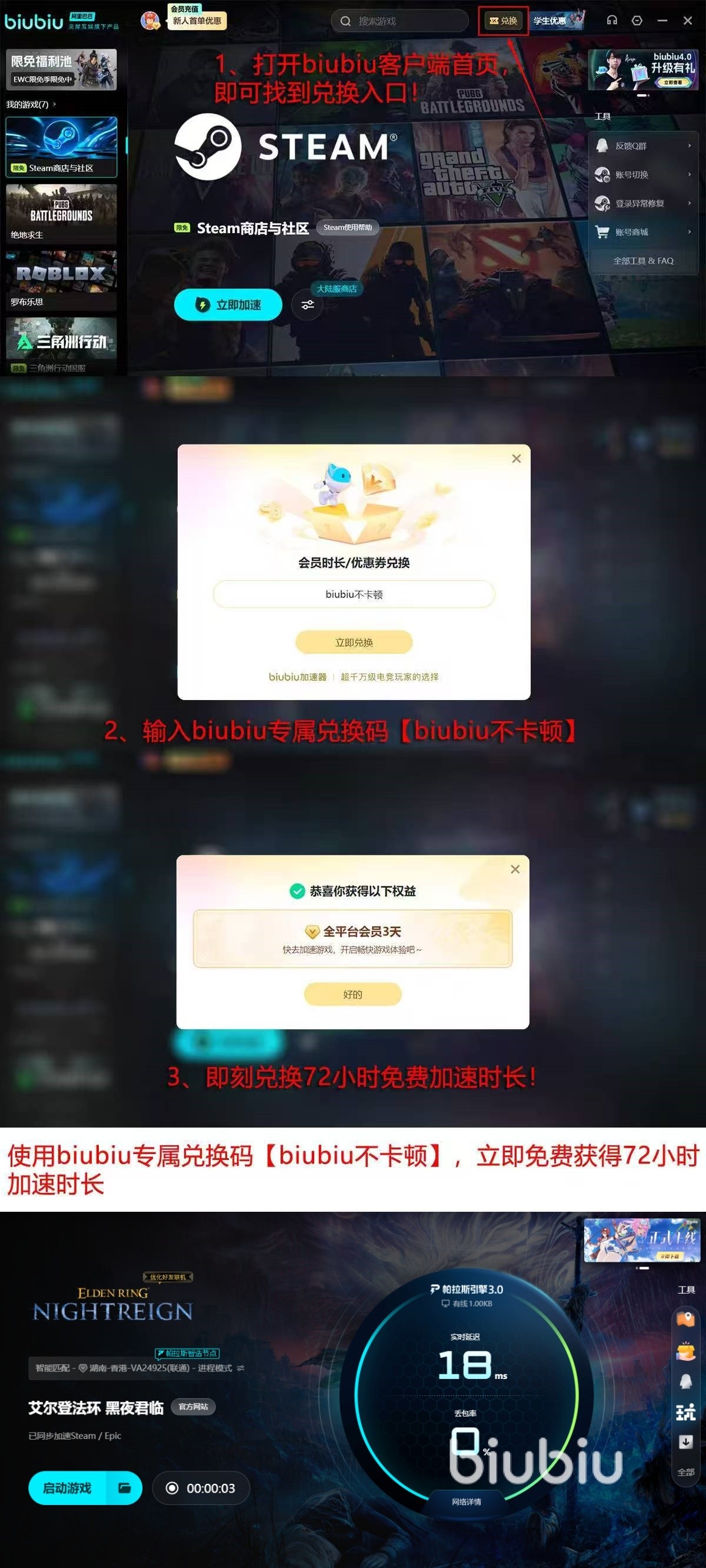 而对于广大小伙伴们而言,若是长时间体验游戏,那么还可借助【biubiu不卡顿】,在兑换界面就能顺利领取到72H的加速,让自己去长时间体验,也不用担心会遇到掉帧等方面问题所带来的影响。