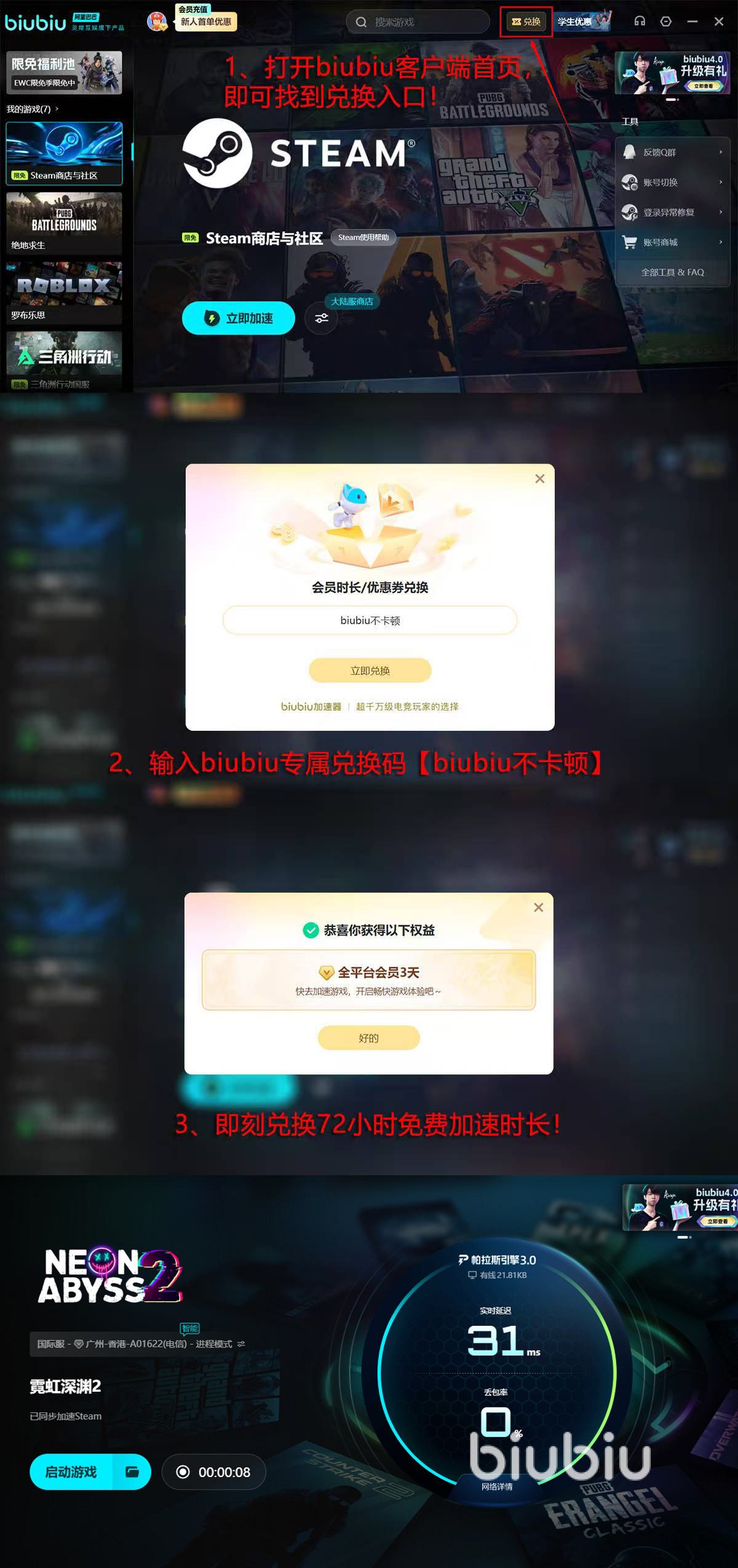 技术飞升、福利享不停,体验最新biubiu加速器加速效果,2大活动可以体验,活动一,新注册用户登录就送24小时免费会员加速,活动二,新注册和老玩家参与口令活动,使用【biubiu不卡顿】在客户端首页兑换72小时加速时长,所有加速时间不限制可玩游戏,即点即玩。并且新玩家可同时参与2大活动,所获时间可累积最高达96小时。