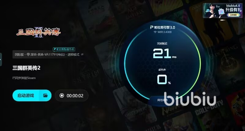 以上就是三国群英传2加速器推荐,biubiu是业内优秀工具,现在已经重磅升级,技术提升,还引入帕拉斯引擎3.0版本,确保加速更稳定,让游戏画面稳定,同时力邀冠军选手Aixleft合力打造,争做新一代强大加速工具,改善实时丢包率。