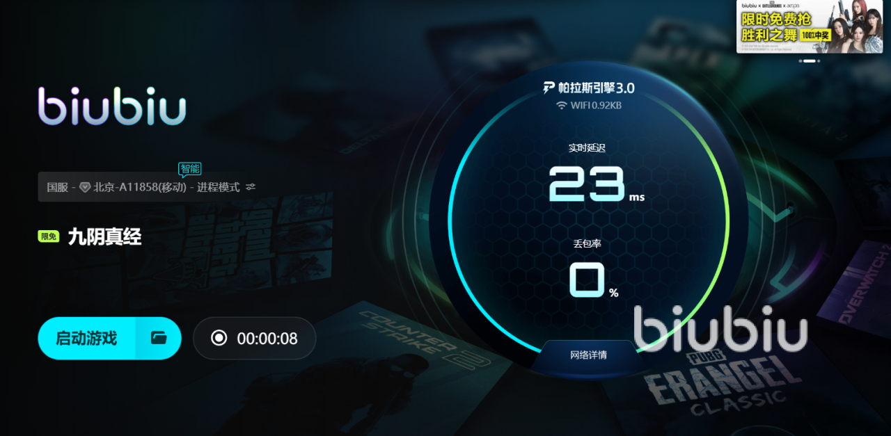 除了丰厚的福利内容,biubiu加速器在技术层面同样表现亮眼。它采用了全新的帕拉斯引擎3.0,带来了更高效的加速性能和更稳定的游戏体验。在稳定性、速度优化和节点调度上进行了系统级升级。这一技术突破不仅显著降低了连接延迟,还提升了在高峰期保持网络稳定的能力。值得一提的是,这次升级由biubiu团队携手电竞冠军Aixleft共同完成,结合职业选手的实战需求与技术团队的加速逻辑,打造出更贴合玩家需求的加速服务。这对于高强度对战和团战频繁的《九阴真经》来说,无疑是锦上添花。