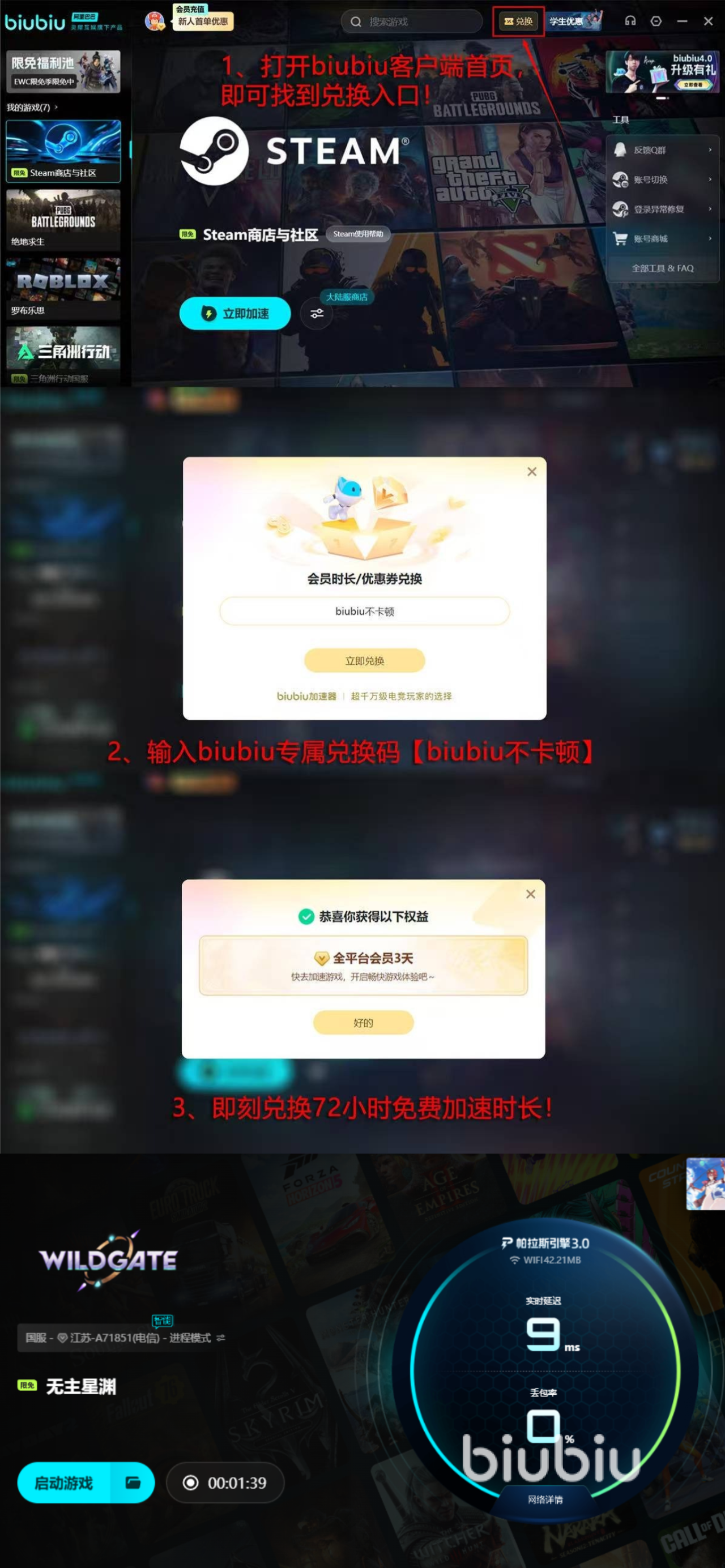 上方小编给大家推荐的这款加速应用很适合大家去用,而且提供了很多福利,新人注册里立刻就有24h免费加速时间可以享受,无需付费,此外还有三天免费时间可以兑换,每个用户都可以领取一次,输入【biubiu不卡顿】即可。