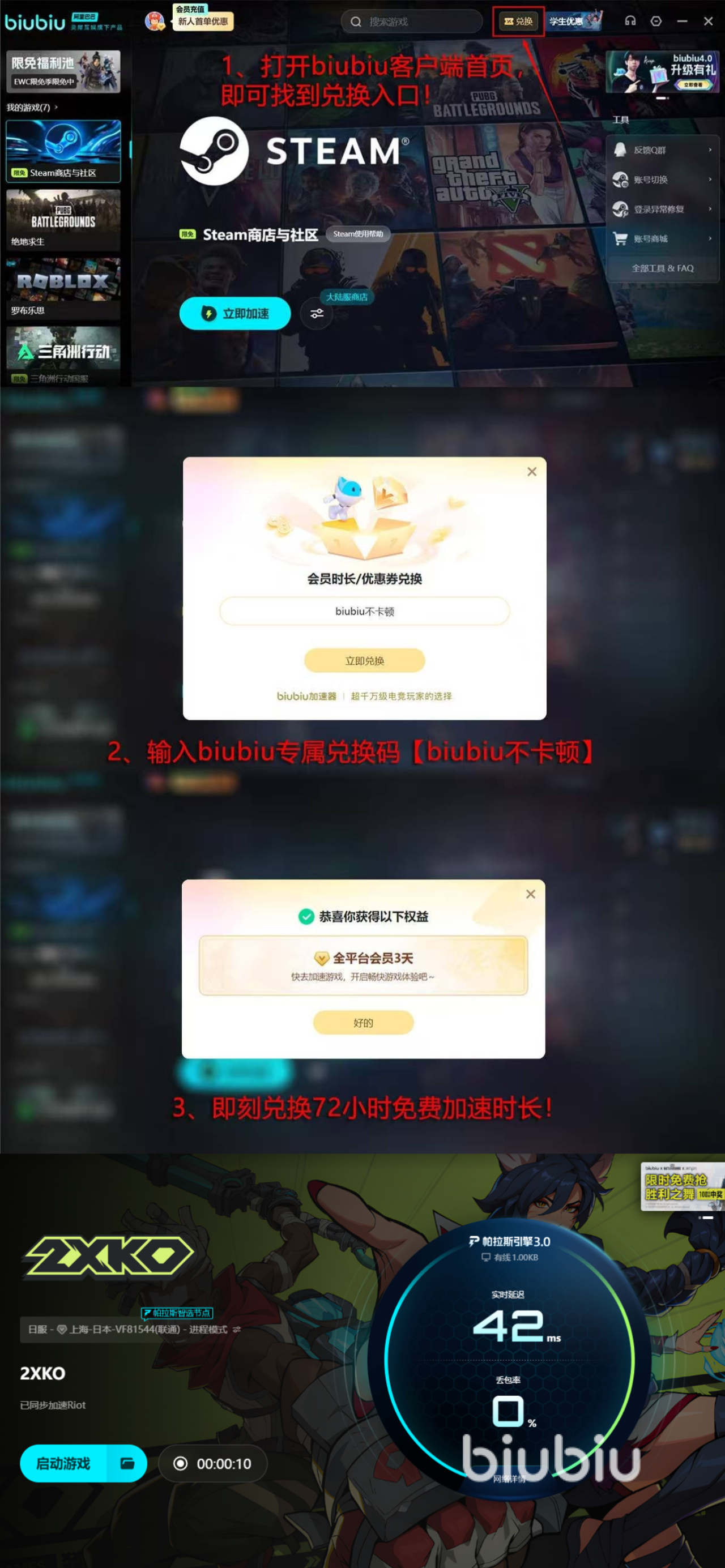 要是大家之前没有用过这款软件的话,那么正好可以拥有不少福利,新用户登录注册立刻就有24小时免费提速服务可以享受,此外平台还给每个用户都提供了三天加速时长,需要大家手动输入【biubiu不卡顿】,如果之前有注册过的小伙伴没有及时体验相应福利的话,也可以选择后续兑换,都是可以不花钱享受会员般的提速效果。