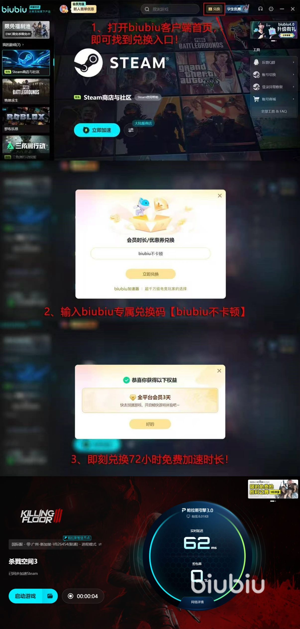新用户下载并注册该工具即可获得24小时vip权限,输入兑换码【biubiu不卡顿】还能在原来的基础上得到72小时加速服务,畅享96小时的加速体验。足够让大家对该工具有一个全面的了解,此外在对应的游戏社区还可以看到其他伙伴的通关攻略,学习游戏技巧的同时还能结交很多的好友。全新升级后携手知名职业选手Aixleft共同优化网络体验,并率先搭载新一代帕拉斯引擎3.0,显著提升连接稳定性与响应速度,为高要求游戏保驾护航,带来更流畅、更高效的游戏环境。