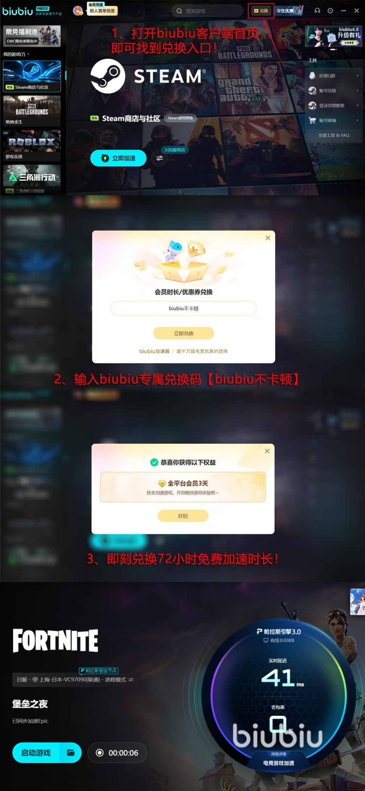 新人登录注册,立刻就有长达一整天的免费体验时间可以享受。此外,每个用户还可以用【biubiu不卡顿】兑换到时候三天的体验时间,都是不需要花钱的,而且当下biubiu还提供了抽奖活动,小伙伴们可以抽取时间不等的免费提速时间,还有机会获得终身体验卡。至于实际的加速效果,大家也无需担心,最近biubiu又进行了更新,现在是和冠军选手Aixleft一起带来的帕纳斯引擎3.0系列,让大家可以毫无负担的畅玩游戏世界。