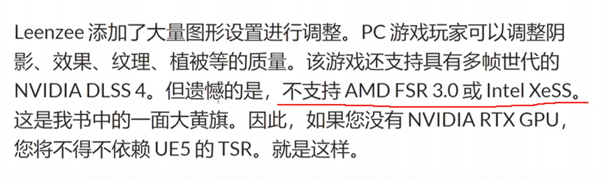 不建议用FSR,会造成锯齿严重,因此画面看起来也会模糊不清,而且TSR也建议使用上面的设置,否则就会模糊感严重,各位可以自行参考。如果想要使用DLSS4,性能表现会比较好,但是注意需要自己下载安装。