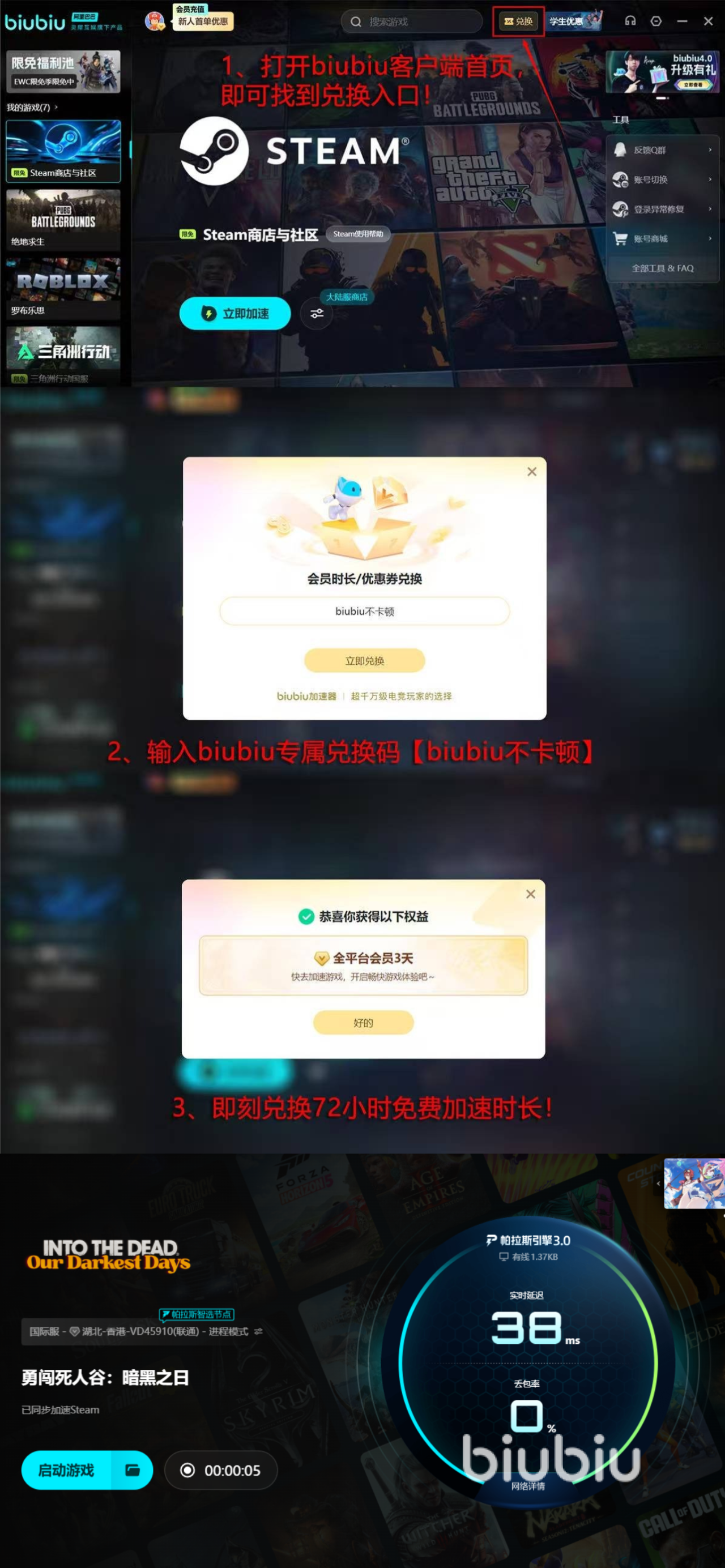 上方给大家提供的加速器对于大家体验游戏是有不少帮助的,首先就是稳定网络,让大家无惧网络不动所造成的各种问题,此外就是能让大家流畅的进行操作。如果是新人登录注册,立刻就有24h提速服务,此外平台还给每个用户额外提供3天加速时长,只需要大家在兑换区域输入【biubiu不卡顿】。还进行了全新升级,平台和Aixleft这位人气冠军选手一起合作推出了新的帕拉斯引擎3.0版本,让玩家可以享受更加舒适的游戏环境。