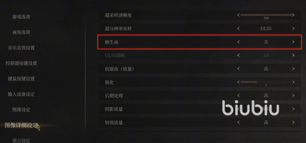 帧生成 (Frame Generation):是提升帧率最有效的手段之一。在图像设置中找到此选项,开启后能显著提升帧数(尤其是在显卡受限时),代价是可能增加操作输入的延迟感。如果关闭,能获得最低的操作延迟,但帧数会相应降低。