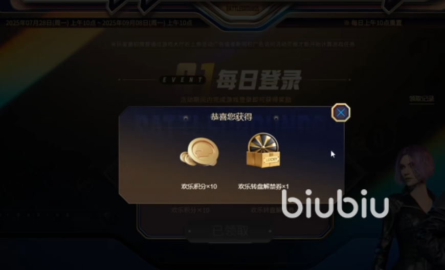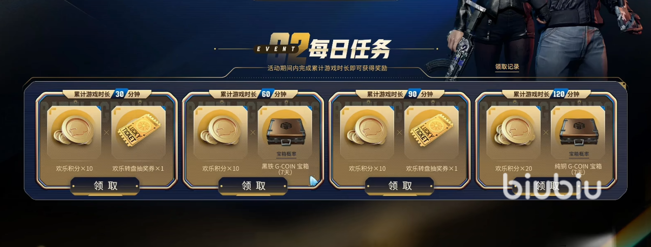 可以看到,每天坚持登录都能得到积分以及转盘券,用来抽奖得到各种道具。另外完成每日任务也能得到不同数值的积分以及抽奖券,积攒的分数能换到枪皮,口罩等道具,如果在线玩到60分钟或者120分钟,还有G-Coin宝箱得到。想要稳定在线玩游戏,biubiu肯定要用上。