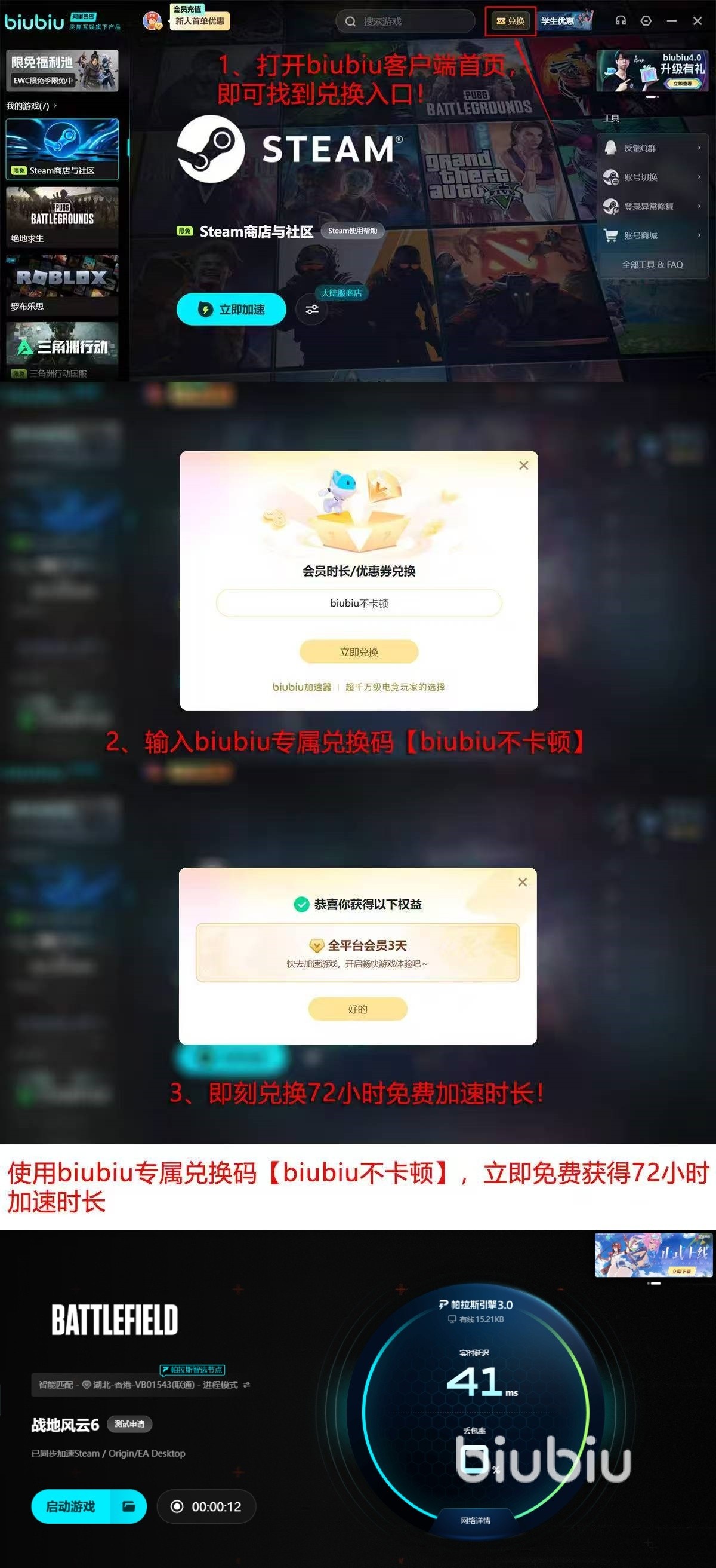 在福利方面本次也是非常给力,其中新用户首次登录就能成功领取24h加速,让大家到时能实现长时间体验,而不用担心会遇到卡顿等方面影响,如果说希望能去领取到更多加速福利,那么主动去点击兑换,然后借助【biubiu不卡顿】,这样所有平台小伙伴均可顺利得到72H加速时长。