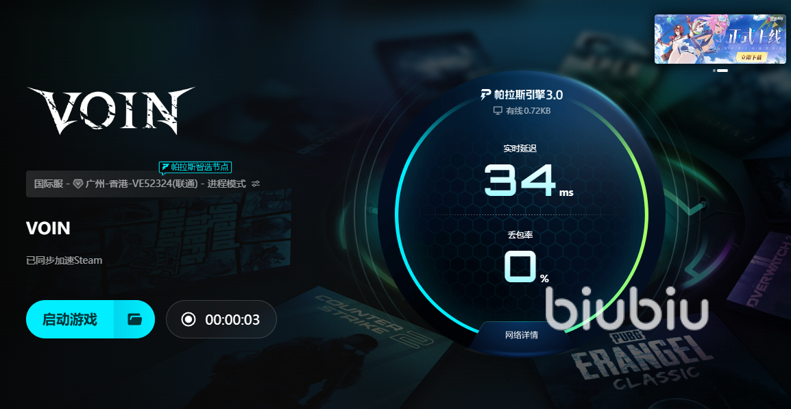 除了基础的网络优化,biubiu加速器在技术引擎层面也进行了重构升级。目前搭载的帕拉斯引擎3.0系统,能够根据玩家地理位置与游戏服务器位置智能匹配最优线路,实现多节点实时调度,大幅降低中转消耗和链路不稳定所带来的延迟问题。这一系统由biubiu团队联合电竞选手Aixleft共同打造,从竞技级别出发优化数据传输逻辑,使得《voin》这类游戏在进行高频操作(如滑铲、闪避、近战搏杀)时的同步性能更加流畅。加速不仅体现在单局加载快、丢包少,更在长时间游戏过程中维持稳定,不容易因网络波动而崩盘。