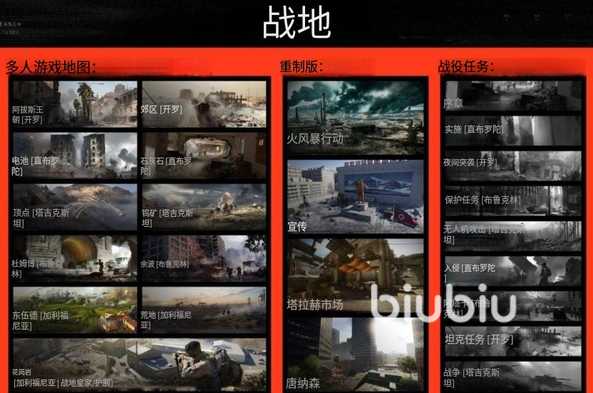 玩家们根据试玩视频以及官方给出的pv,总结出来以下内容。可以看到多人图中有开罗,直布罗陀,塔吉克斯坦,布鲁克林加利福利亚这5大地区,每个地区两张图。重制图则是风暴行动,宣传,塔拉赫市场以及唐纳森。小提示,这是玩家总结内容,具体还是以官方准确公告为准,有新消息,或者上线后的总结内容,小编都会及时更新给大家。