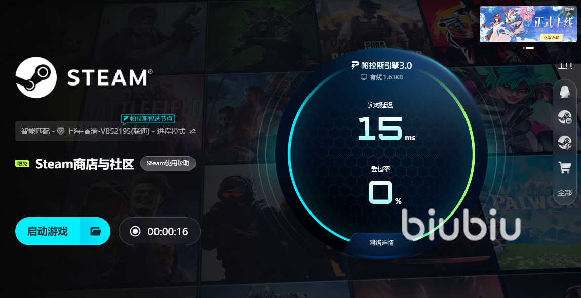 只不过这类游戏在运行期间,玩家的网络方面如果稳定性很差是十分头疼的,所以还需去提前打开biubiu这类工具来优化,如此也是为了能进一步确保自身的体验效果更好,其中的多线路节点和加速优化技术也相当出众。
