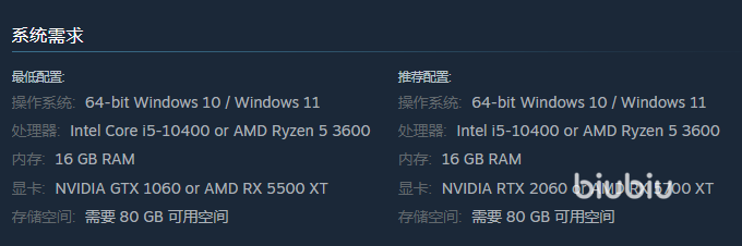 最低配置只能保证大家正常运行游戏,cpu需要是Intel Core i5-10400 or AMD Ryzen 5 3600型号以上,显卡在NVIDIA GTX 1060 or AMD RX 5500 XT这个水平即可,而存储内存一定要留够80G,运行内存必须是16GB以上。