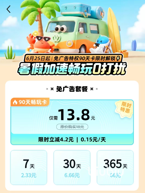 上方给大家带来的这个加速器有很多福利,比如新用户登录注册立刻就有3天免广告提速服务。此外,大家如果还想继续免费使用的话,每天还可通过看视频的方式再额外获得无偿的加速时间,若是想要畅玩那么还可按照自己的需求选择购买不同的会员天数,正好当下有相关的暑期活动,小伙伴们只需要花13.8元即可免广告加速畅玩90天。