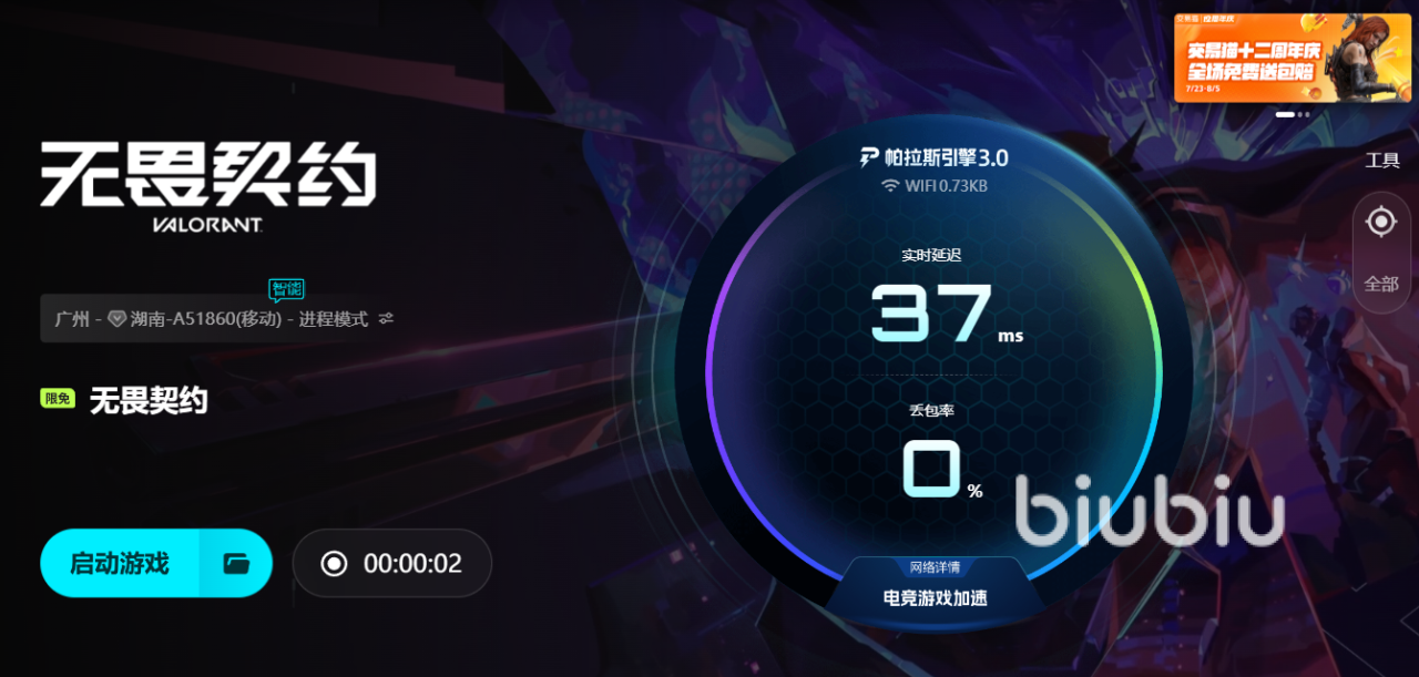 为了解决这一痛点,专业的游戏加速工具成为了玩家首选。其中,biubiu加速器凭借强劲的技术实力与极高的稳定性表现,已经成为许多《无畏契约》玩家的首选。biubiu全面引入了升级后的帕拉斯引擎3.0,通过智能调度系统,能够实时识别并匹配最优传输路径,最大限度规避网络拥堵与数据丢包现象。与此同时,它还与知名职业战队成员、冠军选手Aixleft深度合作,对加速策略进行了实战级别的优化升级,使得其对《无畏契约》这类战术射击类游戏有着更敏锐的适配和响应能力。不论你是在美服、欧服还是亚服作战,只需开启biubiu,就能显著降低延迟,减少帧率不稳带来的操作干扰。