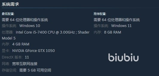 首先,我们来看最低配置要求,需要Windows 10,处理器如果选择酷睿,建议 i5-7400 CPU @ 3.00GHz,或其他类似配置及以上,且需支持Shader Model 5。内存4 GB RAM,显卡上需要GTX 1050及以上,存储空间玩家需要预留5G。