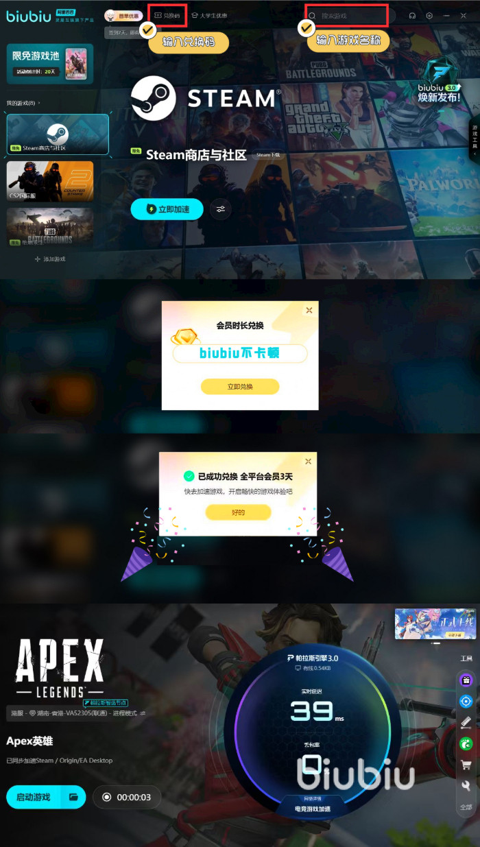 biubiu加速器经过重磅升级,采用了最新的帕拉斯引擎3.0,能够通过智能路由算法实时优化数据传输路径,大幅降低网络延迟和丢包率。结合职业选手Aixleft的实战经验。新用户有24小时的加速时间。【biubiu不卡顿】还可以额外兑换72小时的免费加速时间。通过使用biubiu加速器,玩家可以在《Apex英雄》这款充满挑战的竞技游戏中,最大化自己的操作潜力,提升游戏体验。