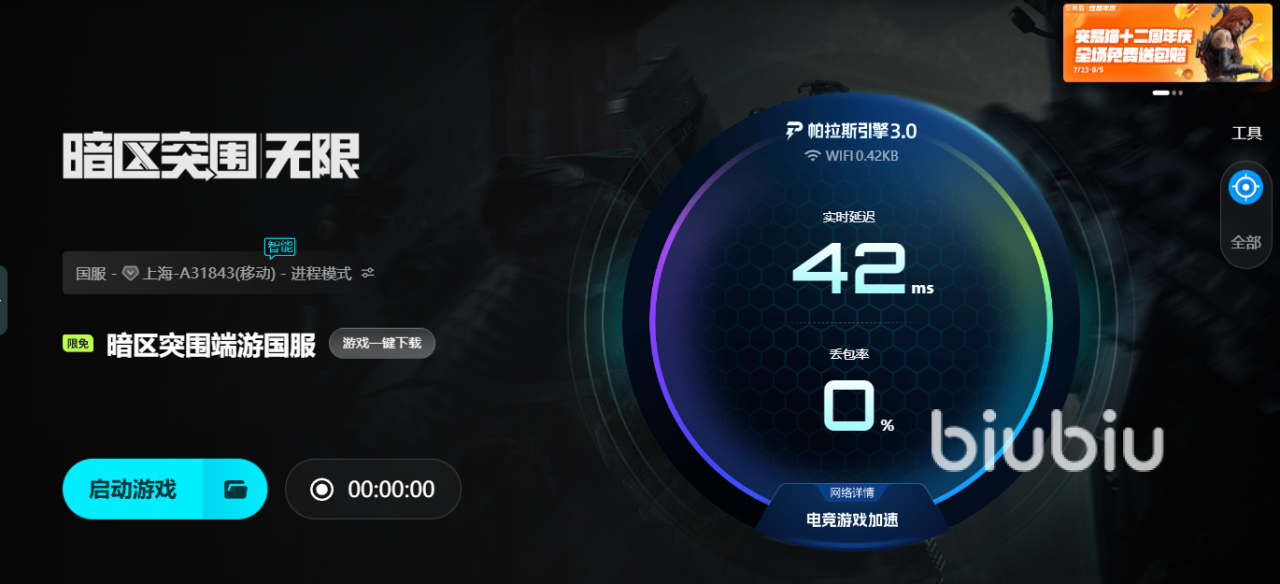 暗区突围多依赖服务器资源调用,包括图像、音效、语音包、剧情更新等核心内容都需要联网加载,尤其是在初次安装时,若遇到高延迟网络,就容易出现加载失败、语音不同步或卡住无法进入下一段剧情等尴尬问题。这种情况在跨区游玩时更为明显。因此,为了获得更完整、流畅的沉浸体验,玩家完全有必要提前配备一款稳定的网络优化工具。而biubiu加速器,正是这类以连贯性为重的游戏最可靠的网络保障。