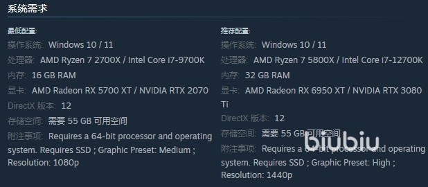 最低配置的游戏要求在Windows 10或11,AMD Ryzen 7 2700X处理器,内存16 GB RAM,显卡AMD Radeon RX 5700 XT。此外,55GB的可用存储空间也是必须的,这些配置虽然能够保证游戏的基本运行,但在高画质下可能会出现卡顿现象,因此建议玩家尽量满足推荐配置。