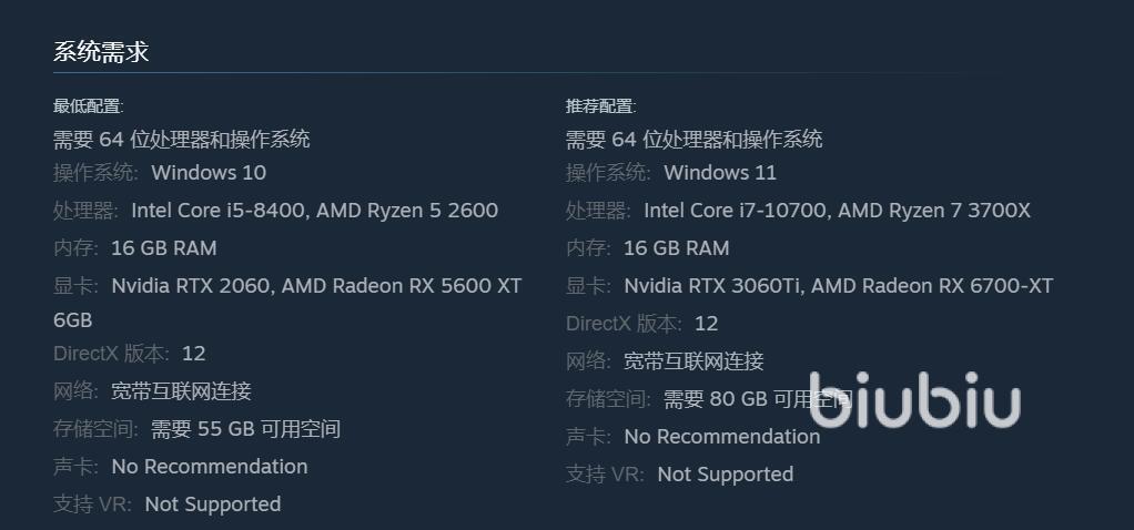 再看推荐配置,RTX3060Ti或RX6700XT、16G内存,适合玩2K分辨率,帧率能稳定在80帧以上。画面细节拉满,连沙子吹在脸上的质感都看得清。内存一定要16GB,不然载入地图慢得要死,还经常闪退。存储空间最低要55GB,推荐留80GB,后续更新还要占空间,别装不下。