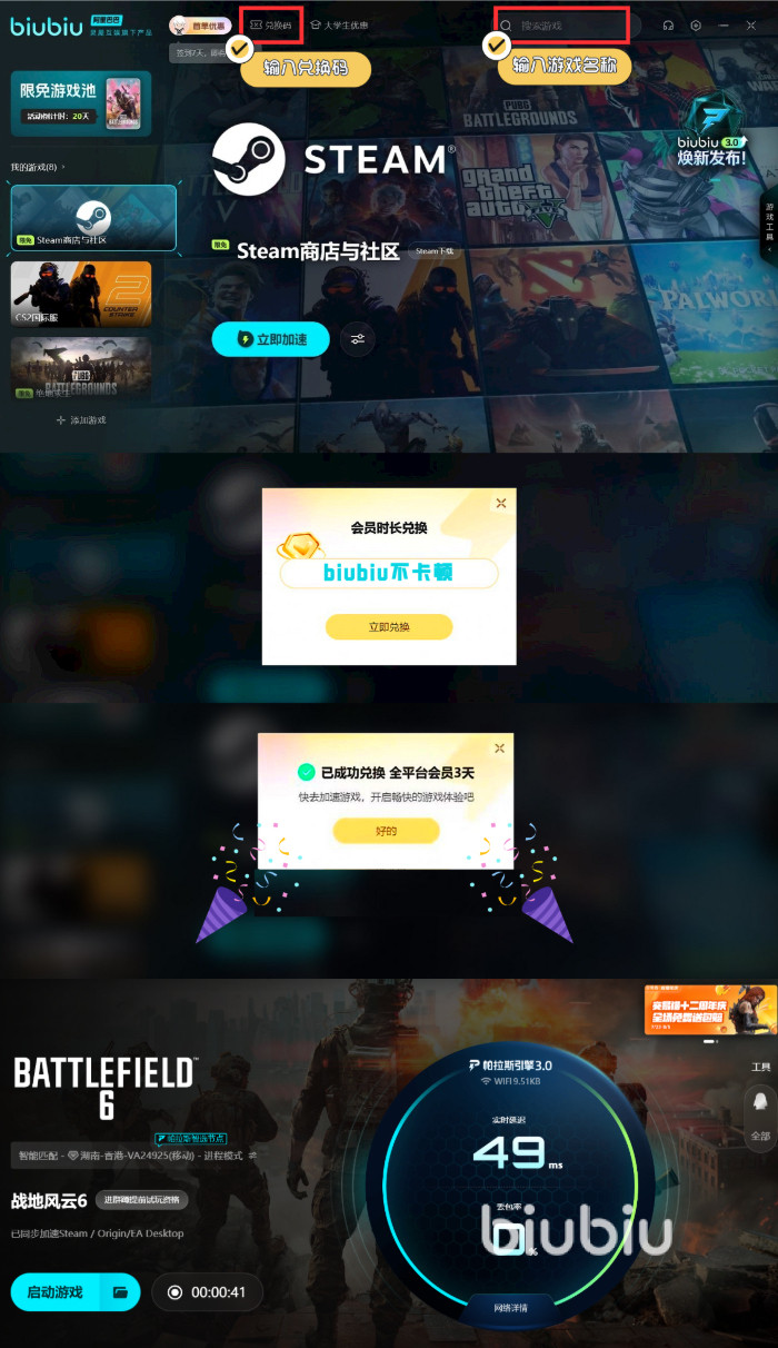 在这种情况下,使用一个强大的加速器工具将是一个非常好的选择。biubiu加速器就是一款非常适合《战地 6》玩家使用的加速工具,帕拉斯引擎3.0与冠军选手Aixleft合力打造。biubiu加速器不仅支持全球多个节点,可以根据玩家的网络环境自动选择最优线路,还能够有效解决因网络波动带来的游戏问题。新用户享受到24小时免费的加速时长,输入兑换码【biubiu不卡顿】后,还能获得额外的72小时免费时长。这对于想要体验创意工坊和多人对战的玩家来说,极大地提升了游戏的稳定性和体验感。