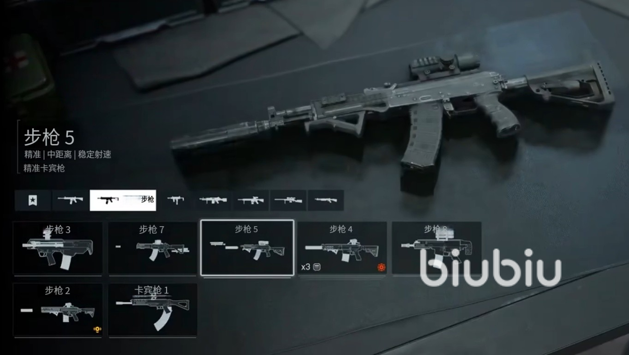 卡宾枪:体型较小更轻便的步枪类型,共有7个类型,优点为精准,准心易于把控。