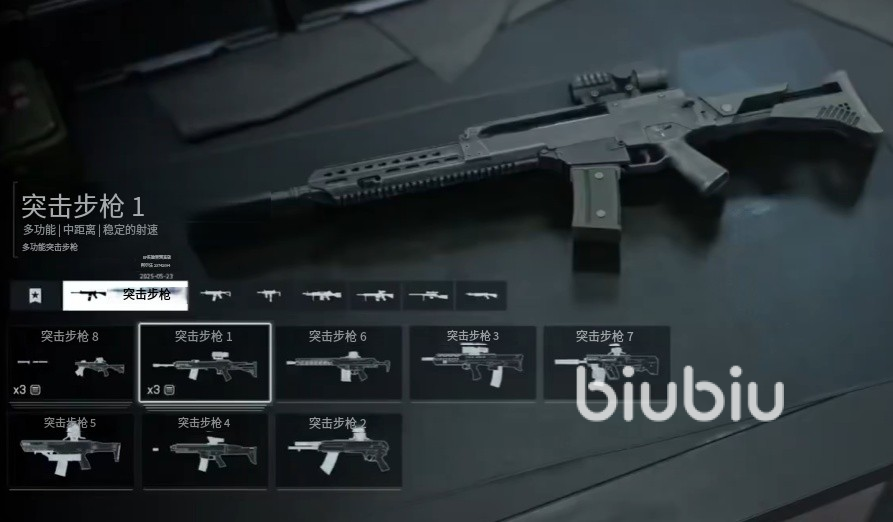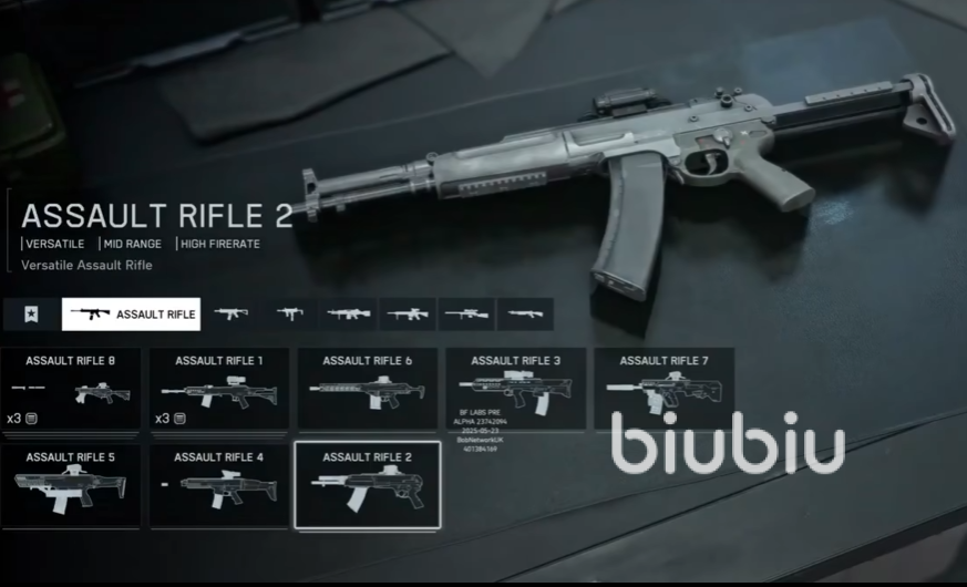 突击步枪:特点为功能全面,中距离作战时射速稳定,共8种,未进行明确命名,从模型上看,可以搭载瞄准器,握把,枪口等辅助配件。